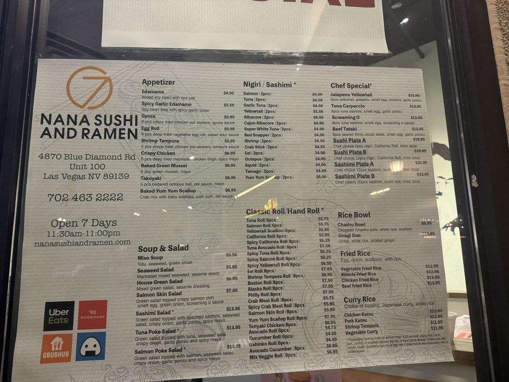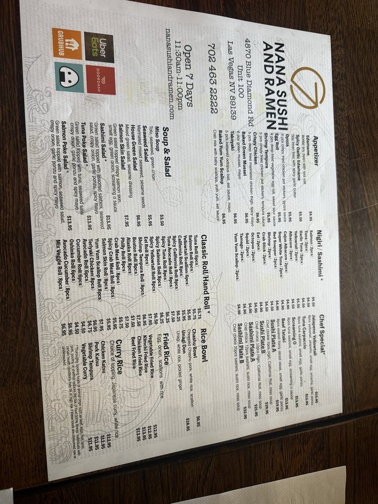 Welcome to Nana Sushi And Ramen, a vibrant culinary gem nestled on Blue Diamond Rd in Las Vegas. This charming establishment specializes in a diverse array of delightful offerings, primarily focusing on ramen and sushi. Their extensive menu features signature rolls like the Nana Roll and 911 Roll, boasting fresh ingredients and bold flavors that deliver an exquisite taste experience.