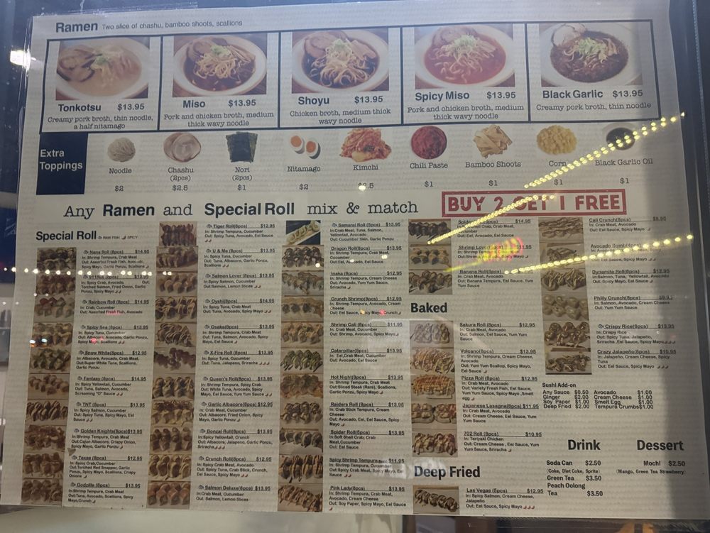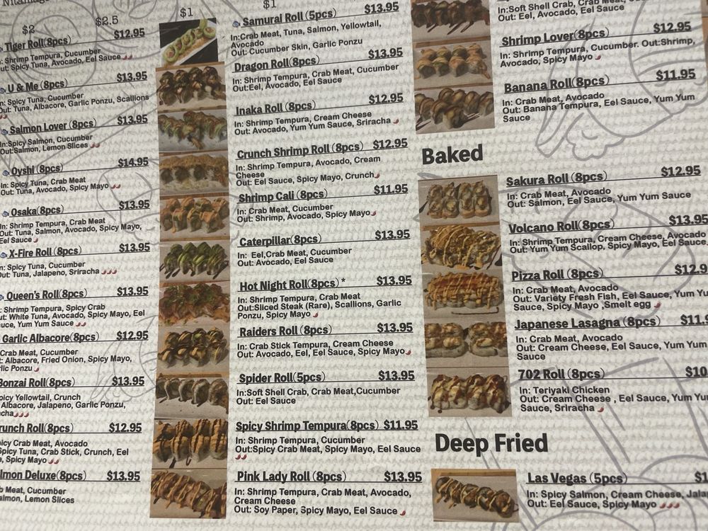 In: Shrimp Tempura, Cream Cheese Out: Avocado, Yum Yum Sauce, Sriracha